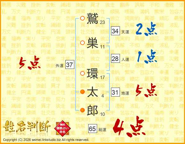 鷲(23画)巣(11画) 環(17画)太(4画)郎(10画)
