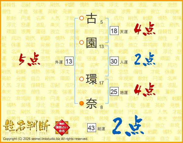 古(5画)園(13画) 環(17画)奈(8画)