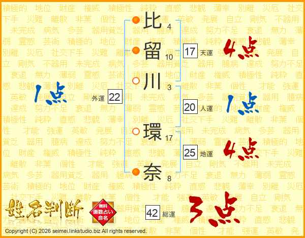 比(4画)留(10画)川(3画) 環(17画)奈(8画)