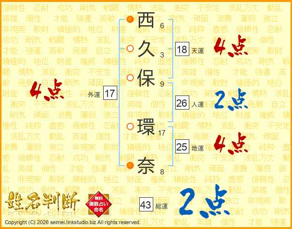 西(6画)久(3画)保(9画) 環(17画)奈(8画)