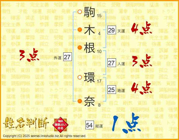駒(15画)木(4画)根(10画) 環(17画)奈(8画)