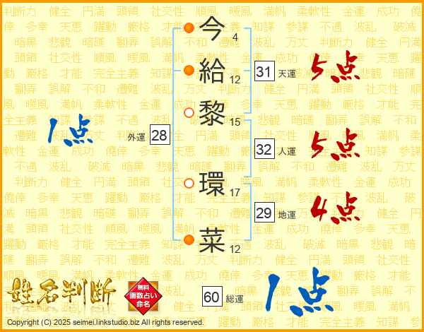 今(4画)給(12画)黎(15画) 環(17画)菜(12画)