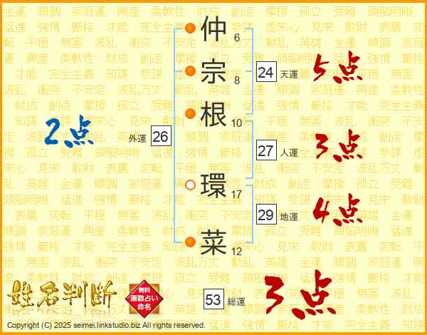 仲(6画)宗(8画)根(10画) 環(17画)菜(12画)