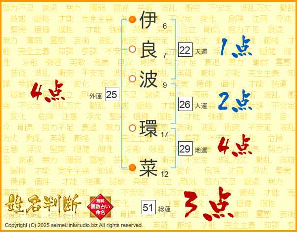 伊(6画)良(7画)波(9画) 環(17画)菜(12画)