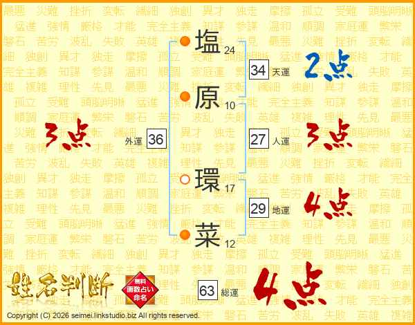 塩(24画)原(10画) 環(17画)菜(12画)