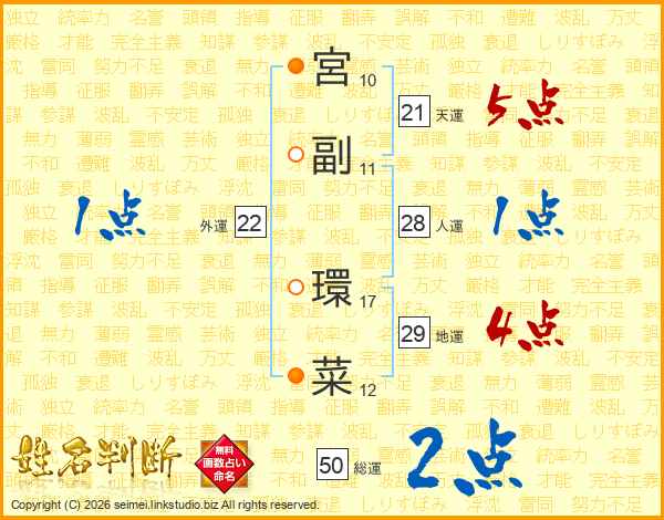生活面を象徴する運勢です。外部から受ける影響力を表し、結婚運、家庭運や職場、環境への順応性を表します。総運から人運を引いた画数。姓や名が1文字の場合を除く。