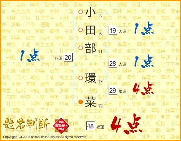 小(3画)田(5画)部(11画) 環(17画)菜(12画)