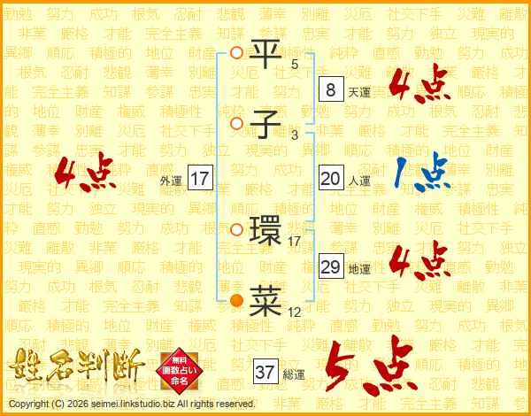 平(5画)子(3画) 環(17画)菜(12画)