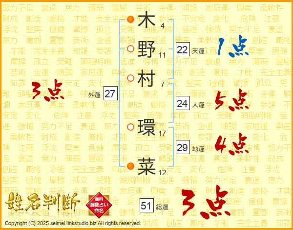 木(4画)野(11画)村(7画) 環(17画)菜(12画)