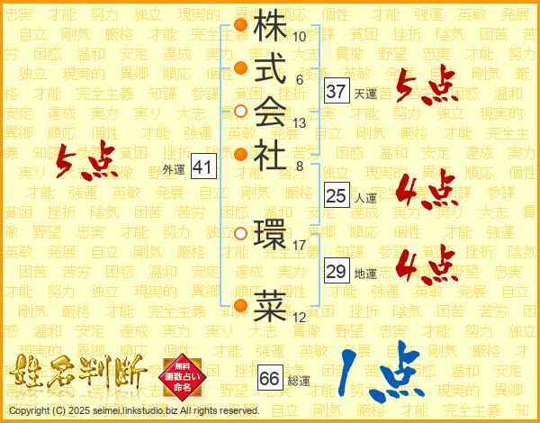 株(10画)式(6画)会(13画)社(8画) 環(17画)菜(12画)