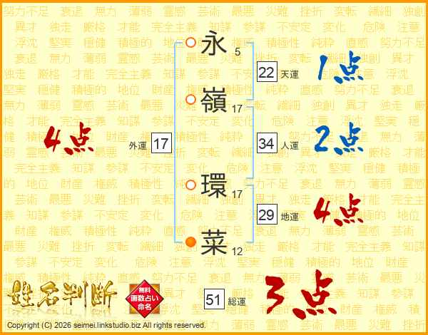 永(5画)嶺(17画) 環(17画)菜(12画)
