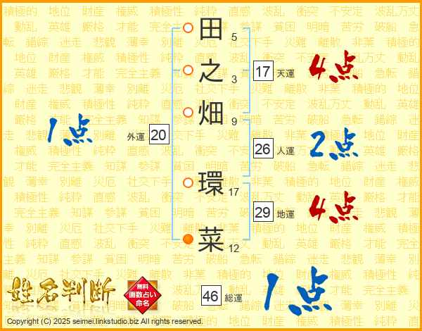 田(5画)之(3画)畑(9画) 環(17画)菜(12画)