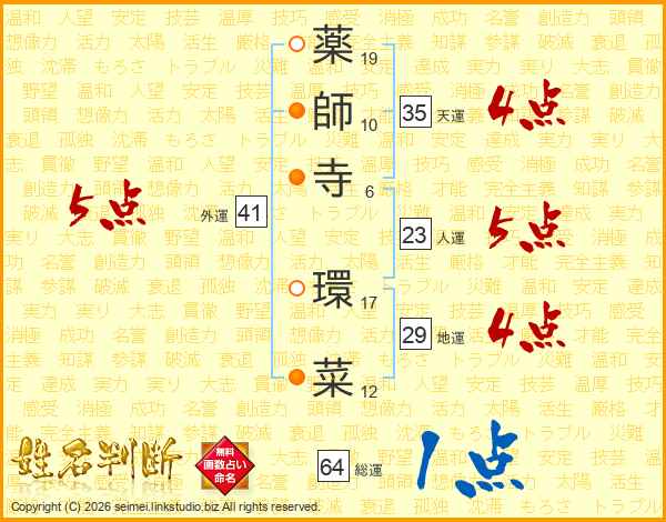薬(19画)師(10画)寺(6画) 環(17画)菜(12画)
