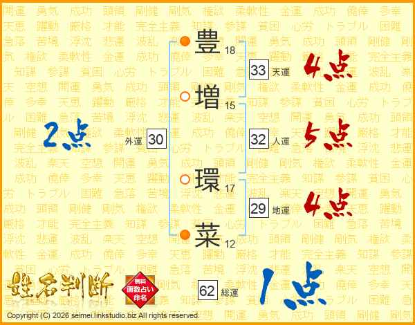 生活面を象徴する運勢です。外部から受ける影響力を表し、結婚運、家庭運や職場、環境への順応性を表します。総運から人運を引いた画数。姓や名が1文字の場合を除く。