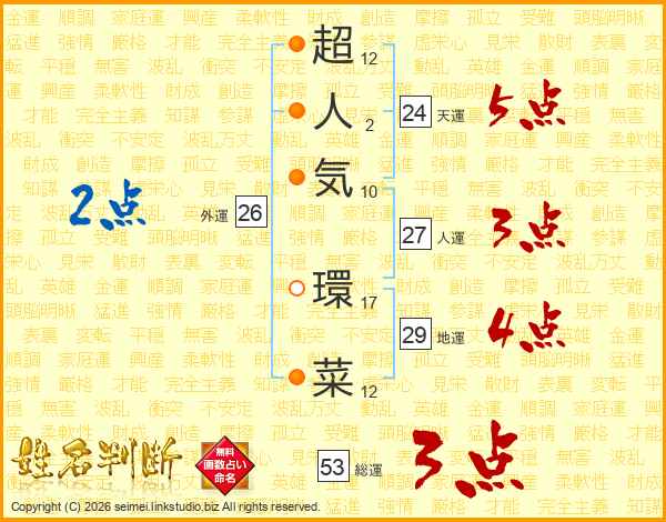 超人気環菜さんの総運は53画の3点!