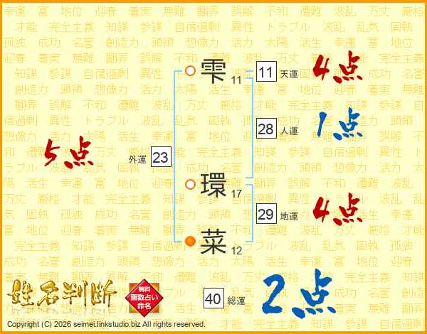 生活面を象徴する運勢です。外部から受ける影響力を表し、結婚運、家庭運や職場、環境への順応性を表します。総運から人運を引いた画数。姓や名が1文字の場合を除く。