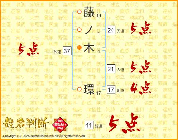 藤(19画)ノ(1画)木(4画) 環(17画)