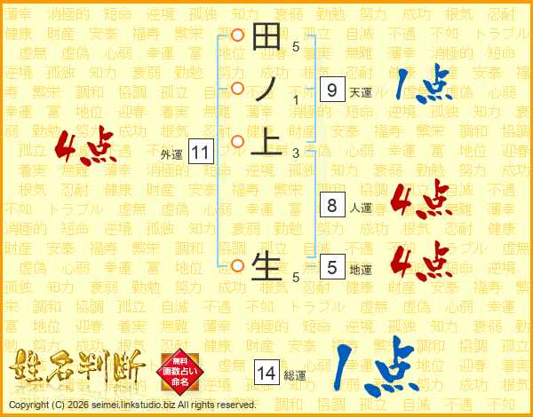 生活面を象徴する運勢です。外部から受ける影響力を表し、結婚運、家庭運や職場、環境への順応性を表します。総運から人運を引いた画数。姓や名が1文字の場合を除く。