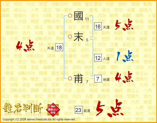あなたの人生を表す1番重要な運勢です。生涯を通じて影響する総合運となり、主に50歳以降の晩年期に影響を及ぼします。苗字と名前の合計画数。