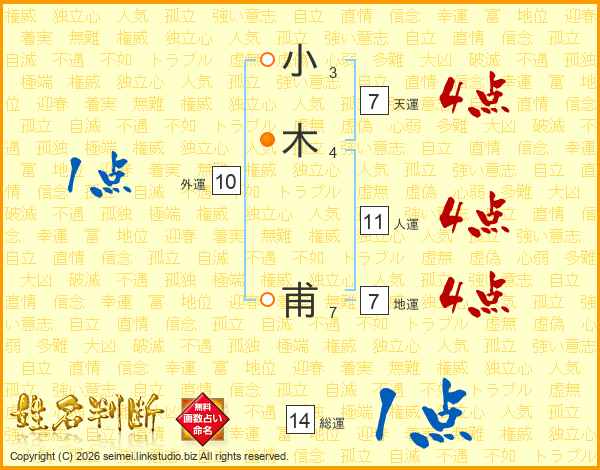 生活面を象徴する運勢です。外部から受ける影響力を表し、結婚運、家庭運や職場、環境への順応性を表します。総運から人運を引いた画数。姓や名が1文字の場合を除く。