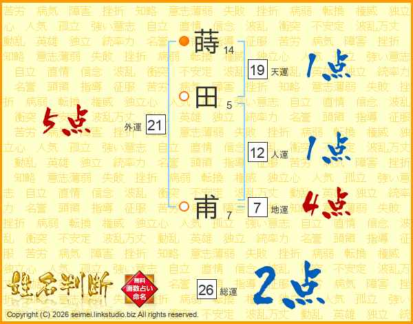 生活面を象徴する運勢です。外部から受ける影響力を表し、結婚運、家庭運や職場、環境への順応性を表します。総運から人運を引いた画数。姓や名が1文字の場合を除く。