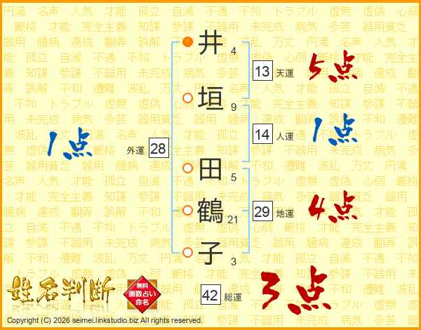 井(4画)垣(9画) 田(5画)鶴(21画)子(3画)