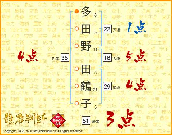 多田野田鶴子さんの総運は51画の3点!
