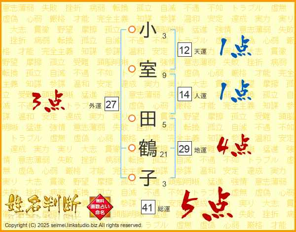 小室田鶴子さんの総運は41画の5点!