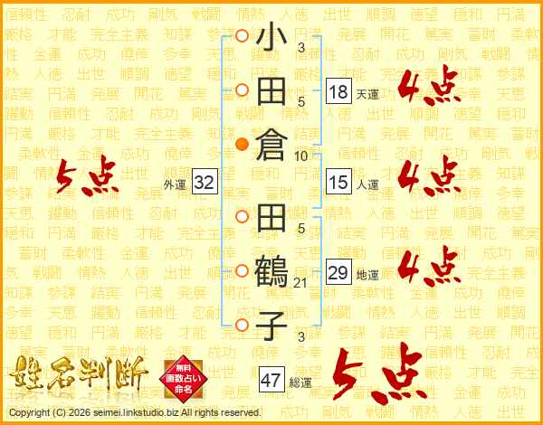 小田倉田鶴子さんの総運は47画の5点!