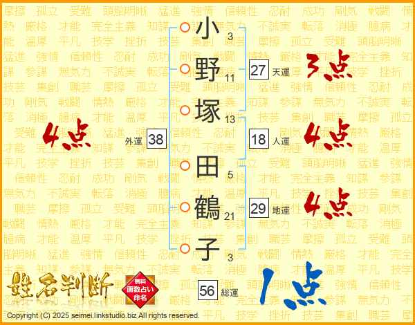 小(3画)野(11画)塚(13画) 田(5画)鶴(21画)子(3画)