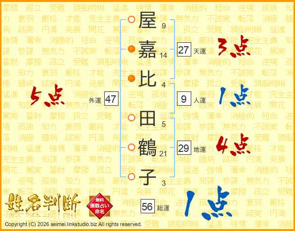 屋(9画)嘉(14画)比(4画) 田(5画)鶴(21画)子(3画)