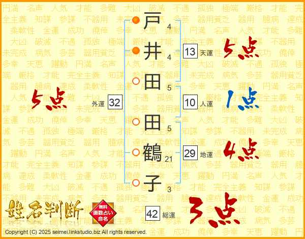 戸(4画)井(4画)田(5画) 田(5画)鶴(21画)子(3画)