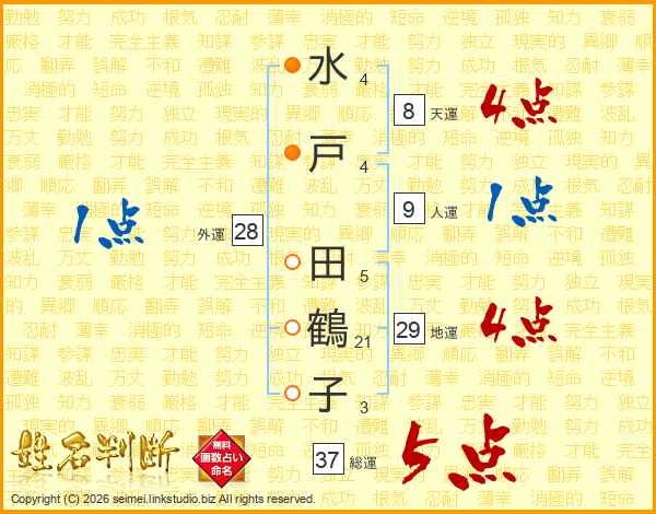 水(4画)戸(4画) 田(5画)鶴(21画)子(3画)
