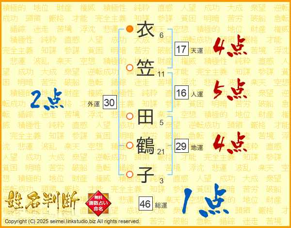 生活面を象徴する運勢です。外部から受ける影響力を表し、結婚運、家庭運や職場、環境への順応性を表します。総運から人運を引いた画数。姓や名が1文字の場合を除く。