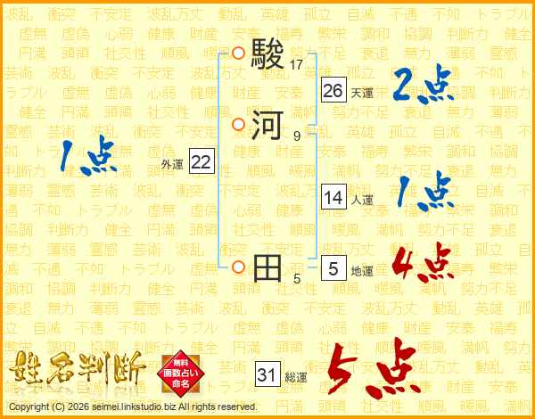 生活面を象徴する運勢です。外部から受ける影響力を表し、結婚運、家庭運や職場、環境への順応性を表します。総運から人運を引いた画数。姓や名が1文字の場合を除く。