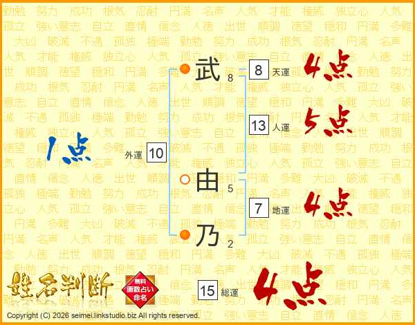 生活面を象徴する運勢です。外部から受ける影響力を表し、結婚運、家庭運や職場、環境への順応性を表します。総運から人運を引いた画数。姓や名が1文字の場合を除く。