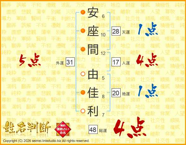 安(6画)座(10画)間(12画) 由(5画)佳(8画)利(7画)