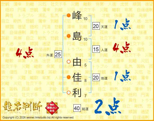 峰(10画)島(10画) 由(5画)佳(8画)利(7画)