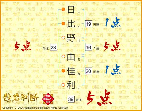 日(4画)比(4画)野(11画) 由(5画)佳(8画)利(7画)