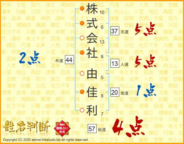 株(10画)式(6画)会(13画)社(8画) 由(5画)佳(8画)利(7画)