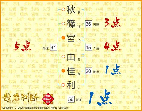 秋(9画)篠(17画)宮(10画) 由(5画)佳(8画)利(7画)