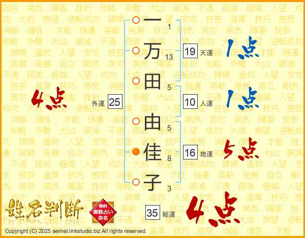 一(1画)万(13画)田(5画) 由(5画)佳(8画)子(3画)