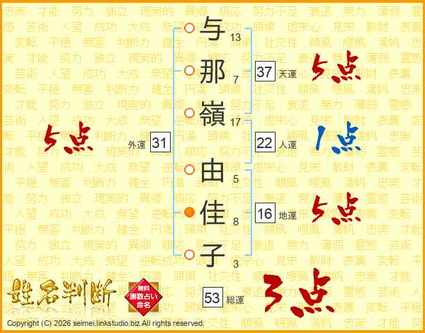 与(13画)那(7画)嶺(17画) 由(5画)佳(8画)子(3画)