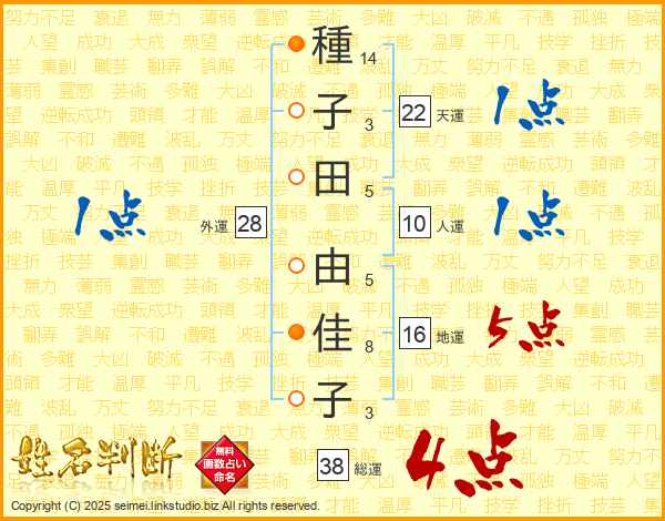 種(14画)子(3画)田(5画) 由(5画)佳(8画)子(3画)
