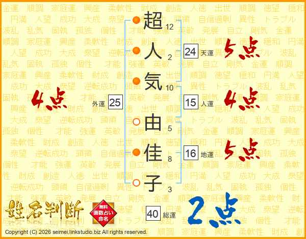 超(12画)人(2画)気(10画) 由(5画)佳(8画)子(3画)