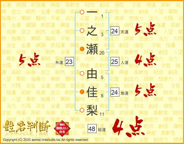 一(1画)之(3画)瀬(20画) 由(5画)佳(8画)梨(11画)