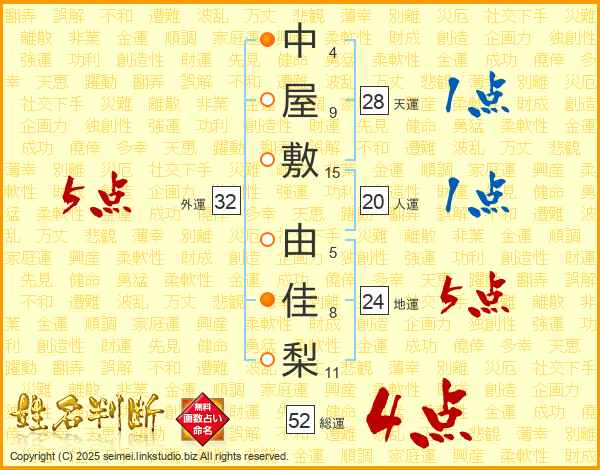 中(4画)屋(9画)敷(15画) 由(5画)佳(8画)梨(11画)