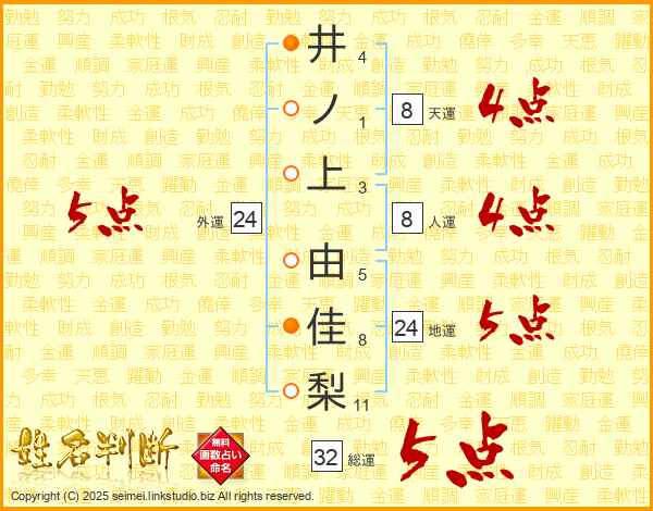 井(4画)ノ(1画)上(3画) 由(5画)佳(8画)梨(11画)
