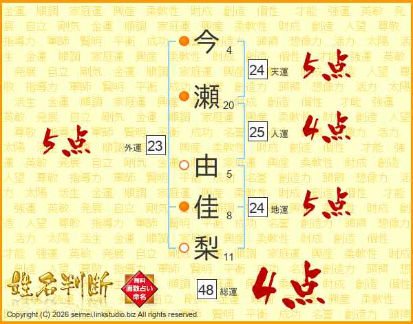今(4画)瀬(20画) 由(5画)佳(8画)梨(11画)