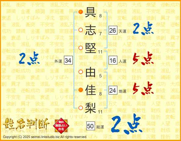 具(8画)志(7画)堅(11画) 由(5画)佳(8画)梨(11画)